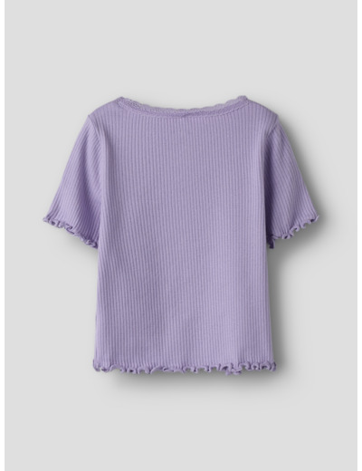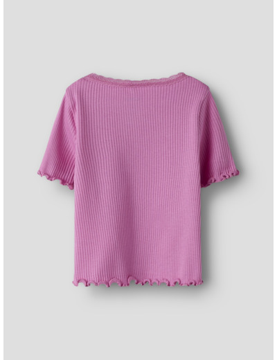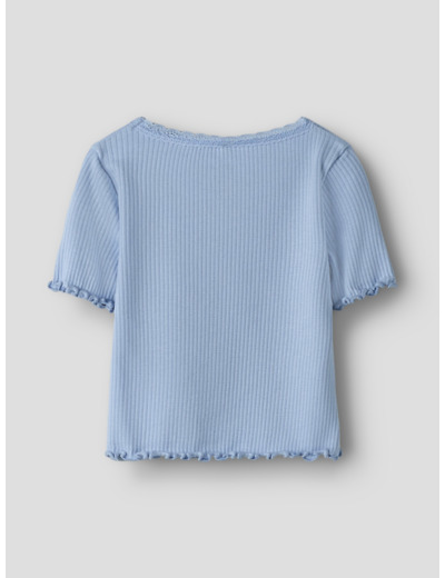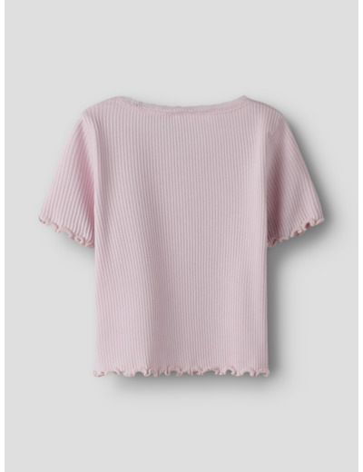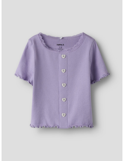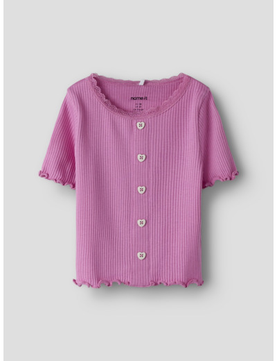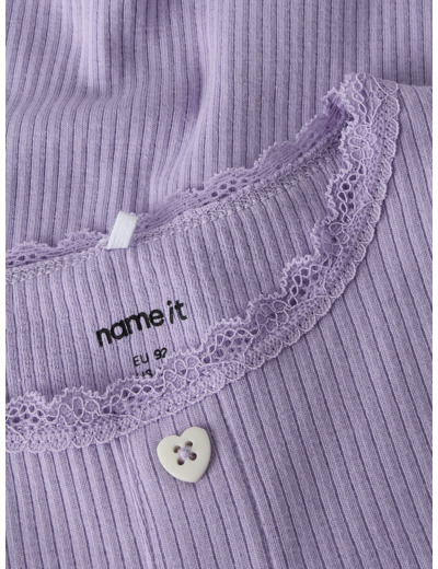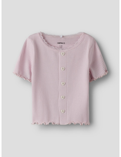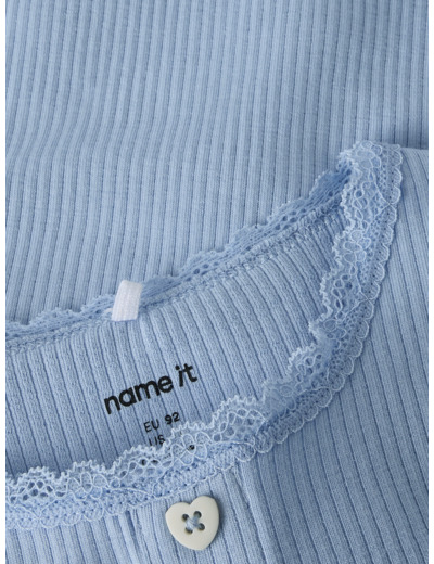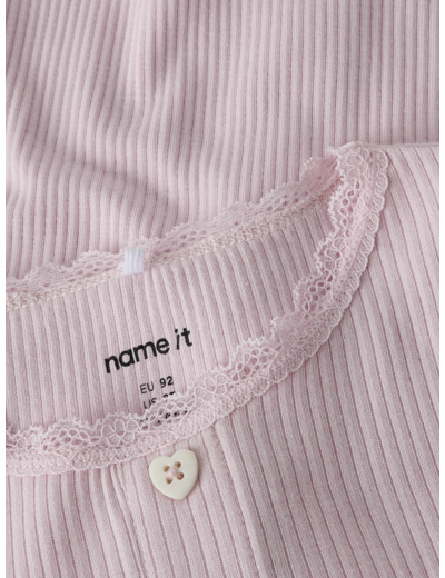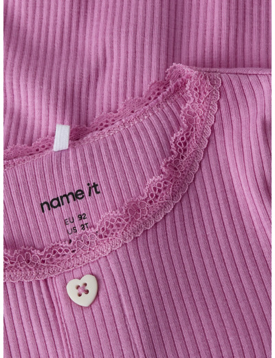Tämä Name It -merkin t-paita on valmistettu joustavasta ribbineuloksesta, jossa on pystysuora raidallinen kuviointi. Materiaali mukautuu lapsen liikkeisiin ja tarjoaa samalla ajattoman, siistin ulkonäön. Pikkutarkat yksityiskohdat, kuten babylock-sauma, napit ja pitsikoristelu, tekevät paidasta erityisen ja huolitellun.