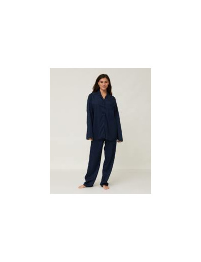 Nuku hyvin erittäin pehmeässä puuvillasatiinipyjamassamme, jossa on helmiäisnapit, pyöristetty kaulus ja rintatasku. Alaosassa on löysä istuvuus ja kuminauhavyötärö.