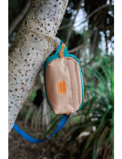 Kierrätetyistä muovipulloista valmistettu vyölaukku, jossa on monia käytännöllisiä ominaisuuksia.