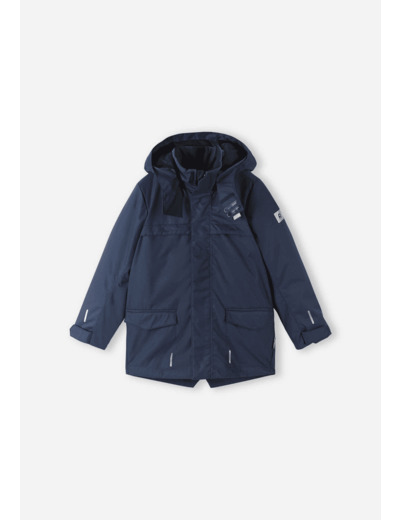 Lasten Reimatec-parkatakki on valmistettu kestävästä teknisestä materiaalista, joka on veden- ja tuulenpitävää, hengittävää sekä pinnaltaan likaa hylkivä. Toppatakin saumat on teipattu vedenpitäviksi, joten sateet eivät haittaa, ja kokonaan kierrätetystä kuidusta tehty vanu lämmittää tehokkaasti. Sileä polyesterivuori luistaa mukavasti pukiessa ja tuntuu miellyttävältä. Takissa on neppareilla kiinnitetty huppu. Rakenne on turvallinen, sillä huppu irtoaa, jos se jää johonkin kiinni. Säädettävät hihansuut, kaksi läppätaskua edessä ja heijastavat yksityiskohdat tuovat lisää käyttömukavuutta. Suoranmallisen talvitakin vyötäröä voi säätää sisäpuolelta.