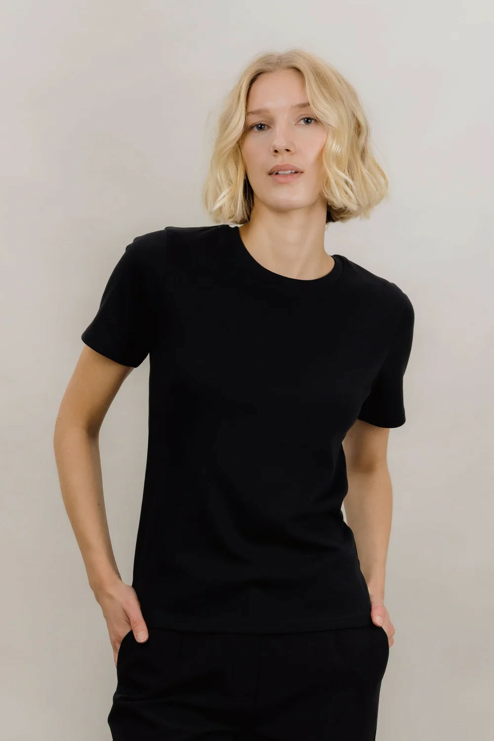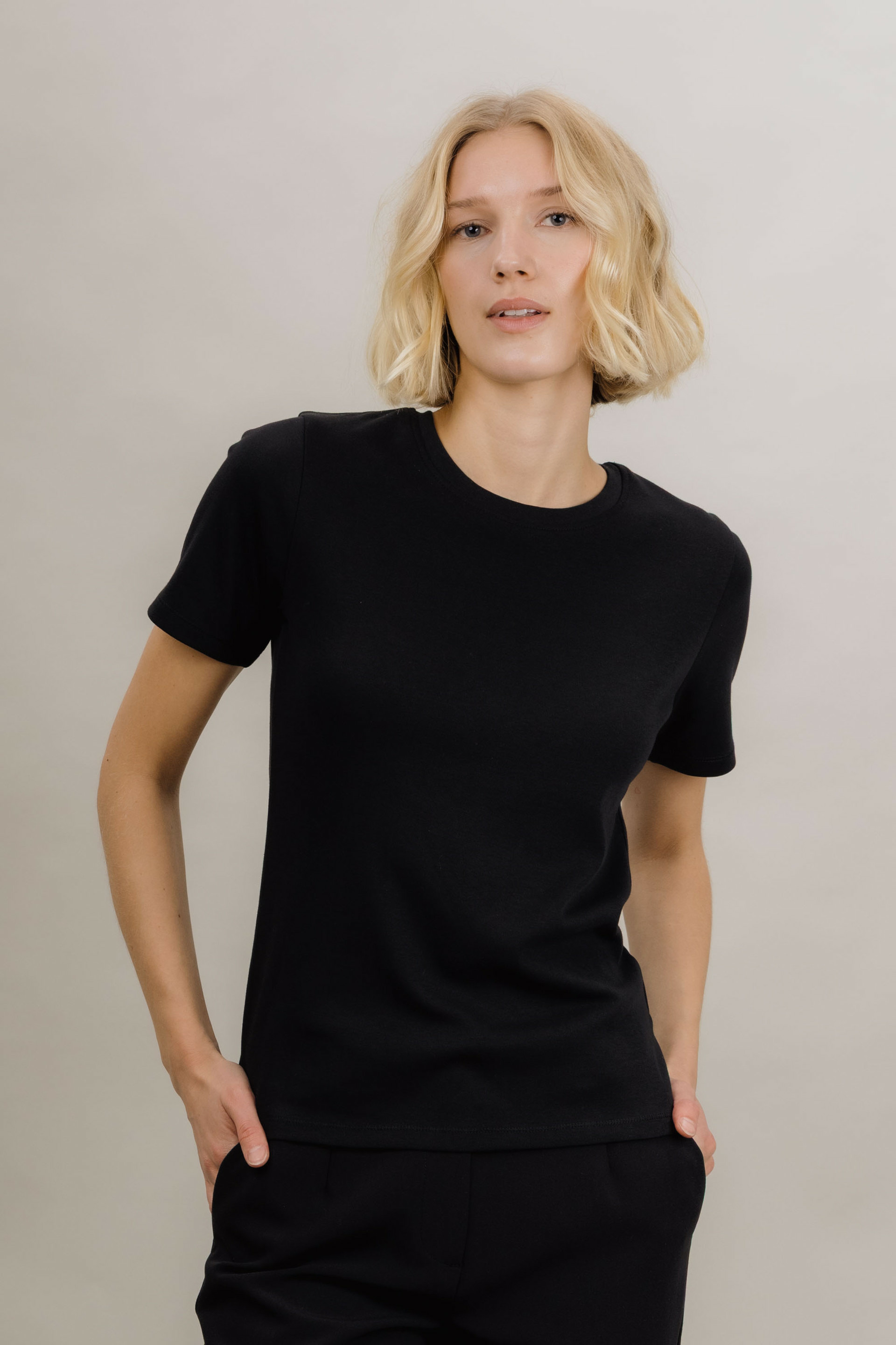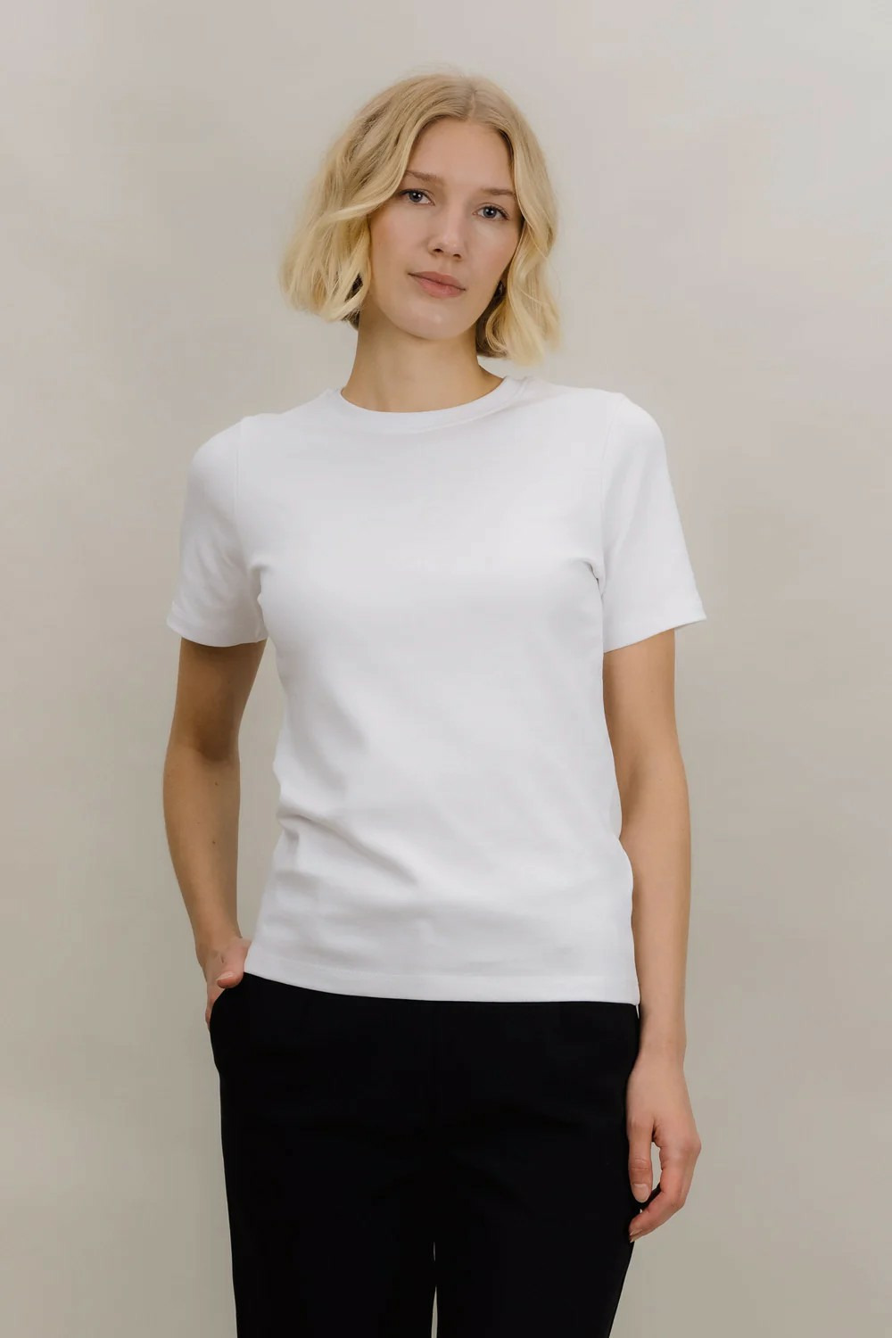 Pehmeä, puuvillainen t-paita on valmistettu luomupuuvillasta ja elastaanista, mikä antaa sille pehmeän tuntuman. Rentoon istuvuus, pyöreä kaula-aukko ja lyhyet hihat.