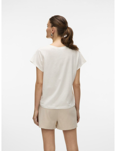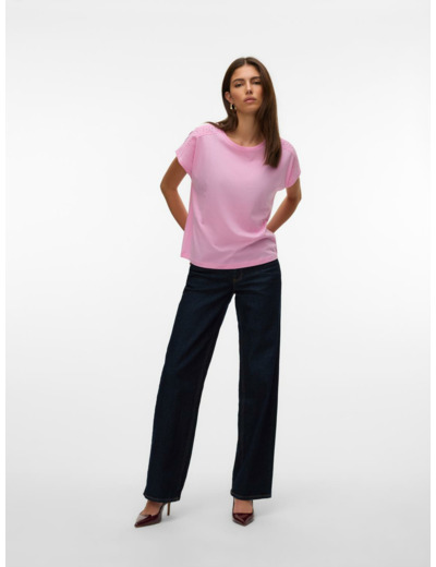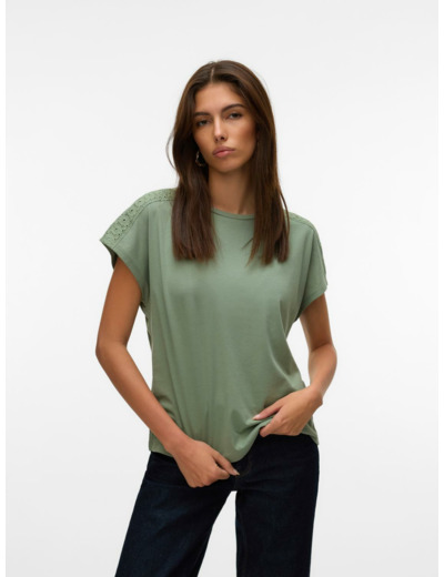 Materiaali ja yksityiskohdat on suunniteltu kestämään käyttöä ja pesuja. T-paidassa on lyhyet hihat, klassinen O-kaula-aukko sekä naisellinen pitsidetaili, joka erottaa sen perusvaatteista.