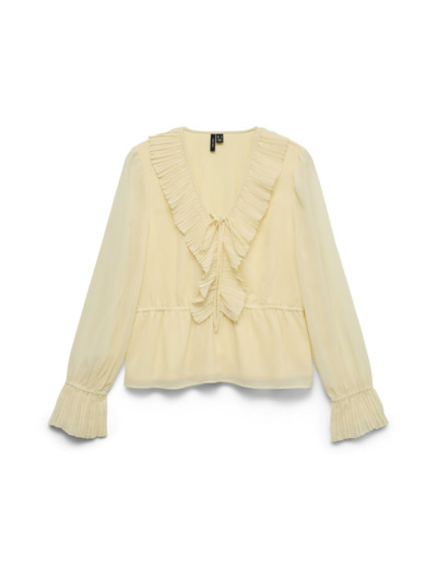 Vero Modan suunnittelema pusero yhdistää klassisen leikkauksen ja naiselliset yksityiskohdat, kuten broderie anglaise -kirjailun ja plissé- sekä rypytyselementit. Volyymimaiset hihat ja joustavat kalvosimet tuovat modernia ilmettä ja mukavuutta. Solmittava nauha viimeistelee ilmeen hillityn tyylikkäästi.