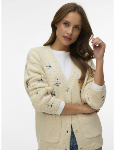 Tuotteen tekniset tiedot: neuletakki, V-kaula-aukko, pitkät hihat, laskostetut olkapäät, napillinen suljenta, etutaskut, kirjailudetaljit, regular fit.