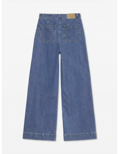 Farkuissa on napitus ja vetoketjusuljenta, edessä ja takana taskut käytännöllisyyttä varten. High rise -vyötärö ja leveä lahje tekevät näistä farkuista ajattoman valinnan jokapäiväiseen käyttöön.